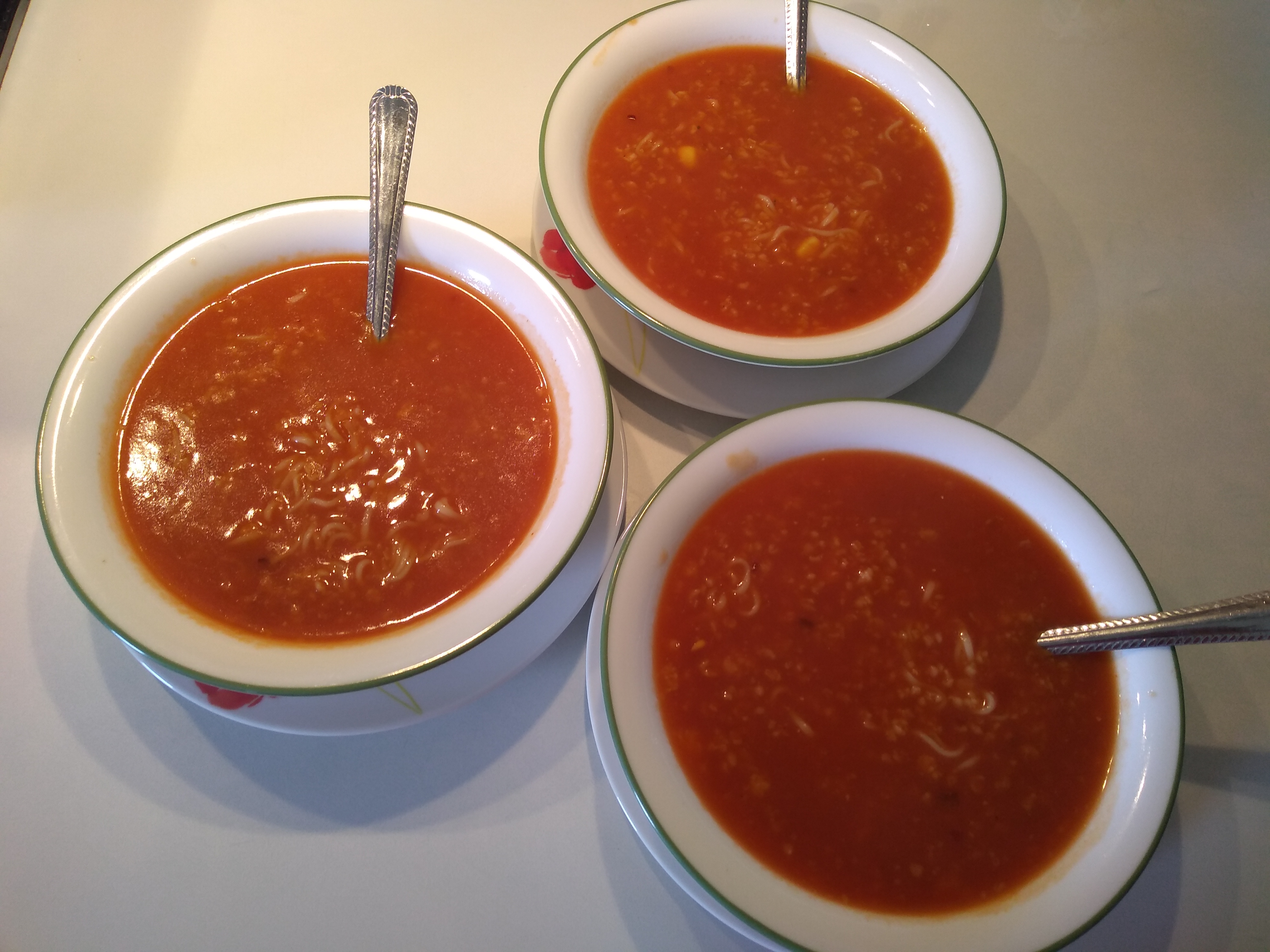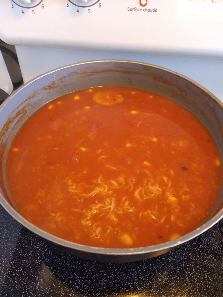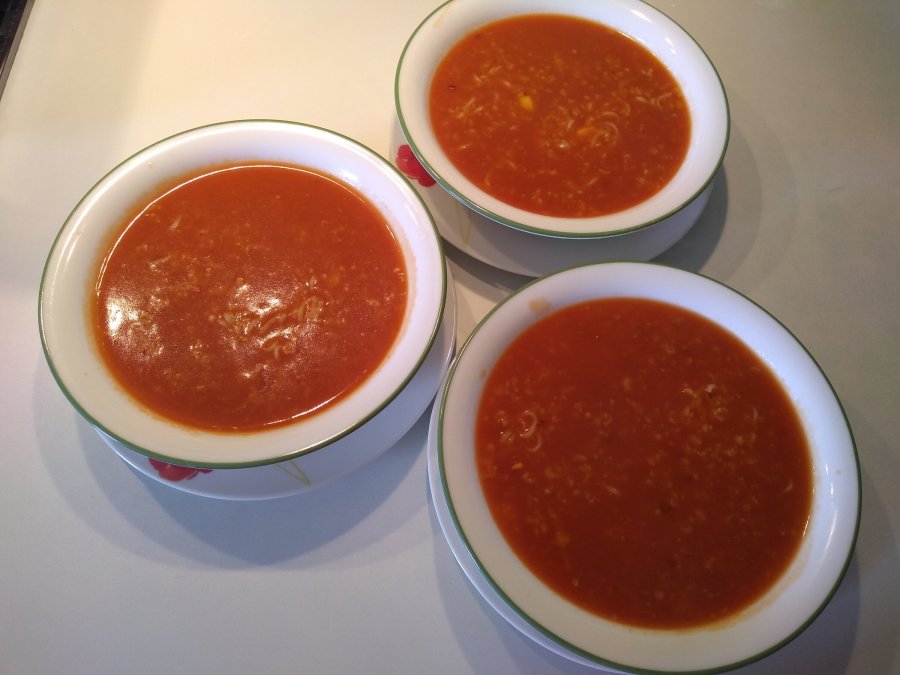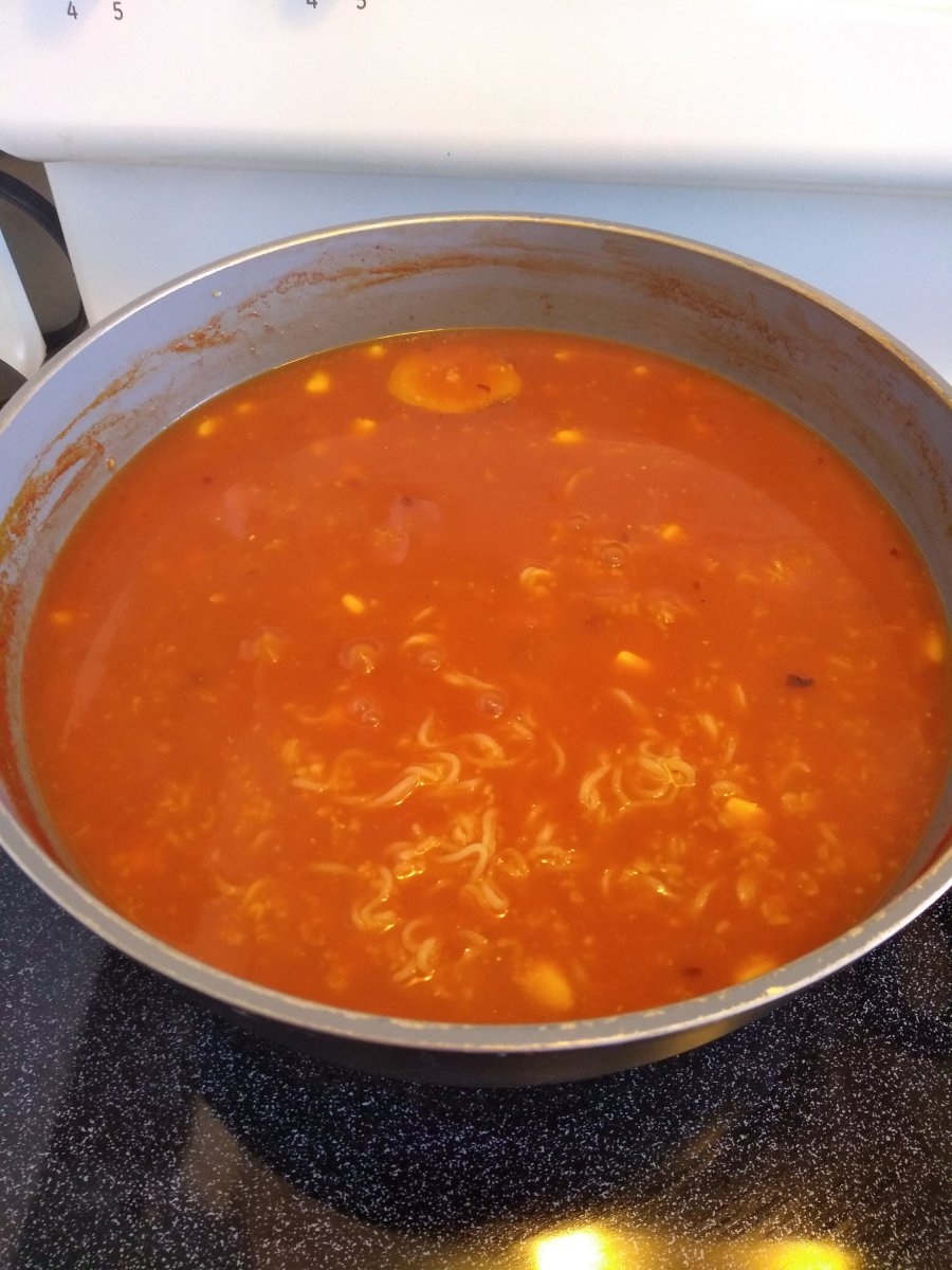 Half a can of tomato puree sauce (250 ml) 2 cups oats, 2 packets of Mr. Noodles, 1 cup of frozen corns, salt, red chili flakes, ginger slice, 1 vegetable cube, and red Tabasco sauce to taste.